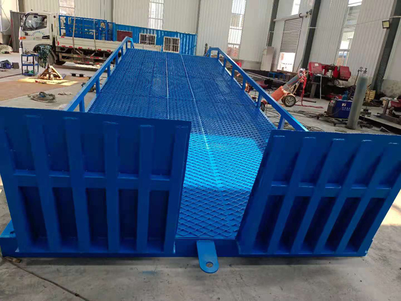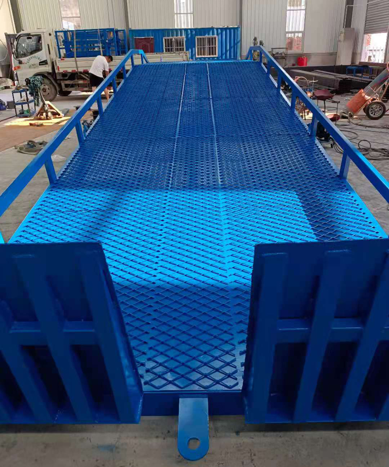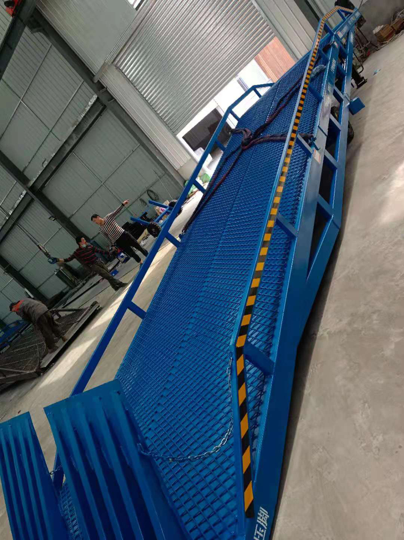移动式登车桥在现代物流现场已是一非常易见的结构形式,它是企业物流链的起点与终点,是企业快速、安全周转产品及货物的一个装卸货操作平台。 装卸货操作平台的高度固定,但来往运输车厢的厢地高度不一,运输车辆与装卸货站台之间总是形成一定的高度落差或间隙。造成搬运叉车不能进出运输车辆直接装卸货物。运用登车桥提供可靠的连接。使搬运叉车能够安全、快速地进出运输车辆进行装卸货作业。使用过程平稳可靠,安全性能高,装卸货物时节约了大量时间,省却了大量人力,使装卸货物大大的提高了效率。台面采用特制的菱形网格板有可靠的强度,能保证长期使用而不变形。它的菱形网状结构,充分保证了防滑性能,使叉车有更好的爬坡性和可操纵性,即使在雨、雪天气,仍能保证正常使用。